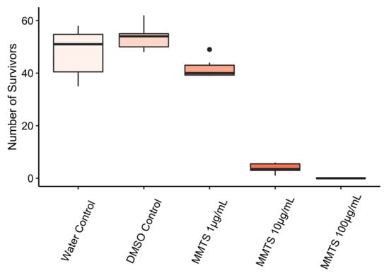 Survival of C. elegans L1 larvae exposed to 1–100 µg/mL MMTS for 48 h. Thick lines in boxplots indicate the average of six replicates. Different letters show significant differences in survival between the treatments according to ANOVA and Tukey’s HSD for post hoc analysis (p < 0.05). In samples treated with a concentration of 10 µg/mL of MMTS and above no adult worms were visible. The experiment was repeated twice with similar results.