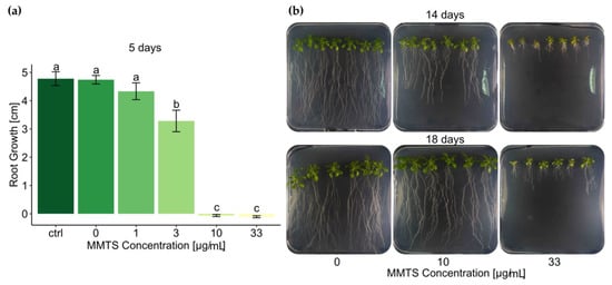 Growth inhibition of A. thaliana seedlings by MMTS: (a) bars show average root growth of seedlings after five days of incubation on growth medium with 0–33 µg/mL MMTS with standard error. The experiment was carried out in 3 repetitions with 6–7 seedlings each. Letters indicate significant differences in root growth between treatments according to ANOVA and Tukey’s HSD for post hoc analysis (p < 0.05); (b) representative pictures of seedlings after growing for 14 days (upper panel) and 18 days (lower panel) on medium containing 0, 10 or 33 µg/mL MMTS.