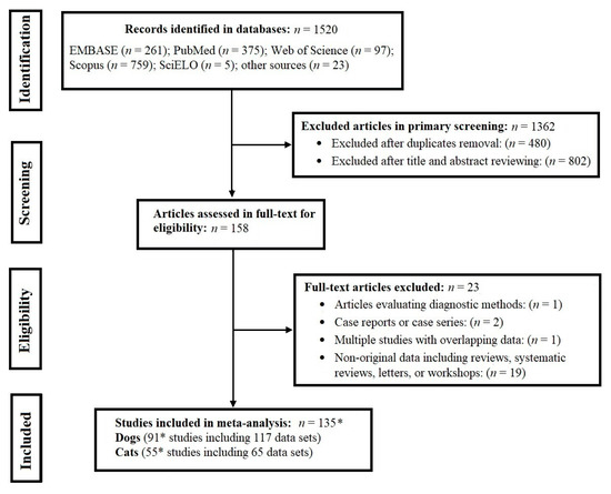 Figure 1 summarises the numbers of publications at each stage of the process. Our search resulted in the identification of 1520 articles, 1362 of which were excluded, following the removal of duplicates and the screening of titles and abstracts. In total, 158 articles with full-texts were assessed for eligibility; 91 and 55 studies of dogs and cats, containing 117 and 65 data sets, respectively, were included in this meta-analysis. These studies provided data for 119,317 dogs and 25,364 cats from 40 and 28 different countries, respectively, from all continents. In total, 74,794/15,114 animals (i.e. dogs/cats) were examined in Europe, 30,880/4222 in North America, 5736/2784 in the Western Pacific region, 3409/1877 in the Eastern Mediterranean region, 2577/319 in Africa, 345/1048 in South America and 1576/0 in South-East Asia. In total, 96,187 and 19,200 pet dogs and cats, 10,031 and 4169 stray dogs and cats and 5966 and 1995 indeterminate (no specified type) of dogs and cats were studied, respectively. Moreover, 7133 working dogs were also tested for Ta. leonina infection. The salient descriptive characteristics of these studies are given in Tables S1 and S2.