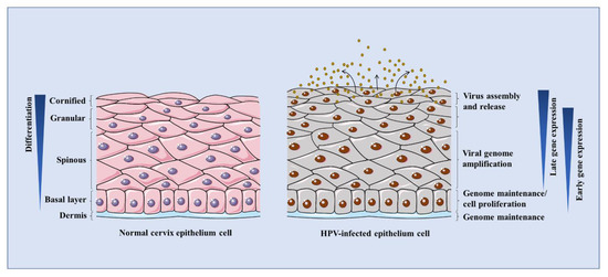 HPV infects the epithelial basal layer possibly through micro-wounds. The infected cells proliferate to construct a base pool for papilloma. HPV episomes are delivered into the host nucleus to cause an infection [12]. During this process, the infected cells are prevented from exiting the cell cycle. Meanwhile, HPV utilizes the cellular contents to accomplish its own replication in synchrony with host cellular DNA at a low-copy rate [44]. After mitosis, the infected daughter cells leave the basal layer and are pushed towards the stratified layers. When the late promoter of HPV is activated by differentiation signals, the viral genomes are replicated to thousands of copies per cell in the process of vegetative genome replication (so referred as to amplification) [45]. The capsids are then synthesized and virions are assembled in the upper terminally differentiated layers [46]. Eventually, the mature viral progeny is released from the uppermost layers of the epithelium, as shown in Figure 2.
