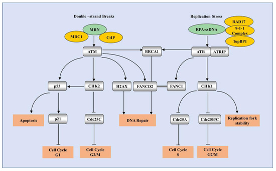 DDR is a complex signaling network directed to maintain cell preservation by regulating multiple pathways of DNA repair, cell-cycle arrest, apoptosis, etc. DDR is regulated by a family of phosphatidylinositol 3-kinase (PI3K)-related kinase (PIKKs), including ATM, ATR, and DNA-dependent protein kinase (DNA-PK) [5]. ATM is recruited to double-stranded breaks (DSBs) through the MRE11-RAD50-NBS1 (MRN) complex [66]. ATR is recruited to RPA-coated single-stranded DNA (ssDNA) in response to DNA replication stress [67], whereas DNA-PK is activated by Ku-bound DSB ends and participates DNA repair [68]. Three mechanisms have been shown to repair DSBs: non-homologous end joining (NHEJ), microhomology-mediated end joining (MMEJ) and homologous recombination (HR) [69,70]. ATM and ATR are two major kinases of HR, while DNA-PK works for NHEJ. The classical pathways of ATM and ATR DDR are summarized in Figure 3.