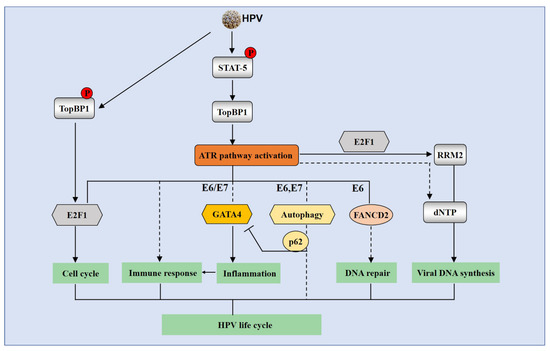 The ATR signaling pathway is involved in the HPV life cycle. HPV phosphorylates STAT-5 in the absence of exogenous DNA damage agents to increase TopBP1 levels, which activate the ATR signaling pathway. HPV also phosphorylates TopBP1 to regulate E2F1 transcriptional activities, which is important for HPV replication. ATR activation is necessary for HPV genomes replication through various mechanisms. The ATR/CHK1 DDR can regulate cell cycle arrest through E2F1 in HPV-positive cells. ATR possibly modulates immune response by GATA4-driven inflammation. ATR is also suggested to be responsible for induction of autophagy, which correlates with the GATA4 signaling via autophagy cargo protein p62. The ATR/CHK1 pathway can act with RRM2 to promote HPV DNA synthesis. The solid arrow means positive regulation, whereas the blocking arrow signifies inhibition. The dotted line represents that the role of the pathway remains uncertain.