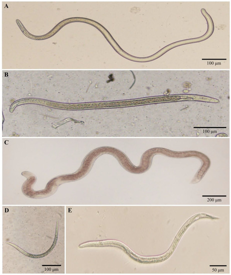 - Digiani, M.C.; Sutton, C.A. New reports and a redescription of Porrocaecum heteropterum (Diesing, 1851) (Ascarididae), a rare nematode parasitic in South American.threskiornithid birds1. Syst. Parasitol. 2001, 49, 1–6. [Google Scholar] [CrossRef]