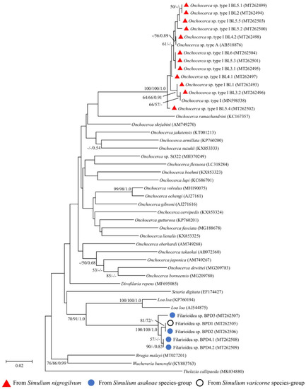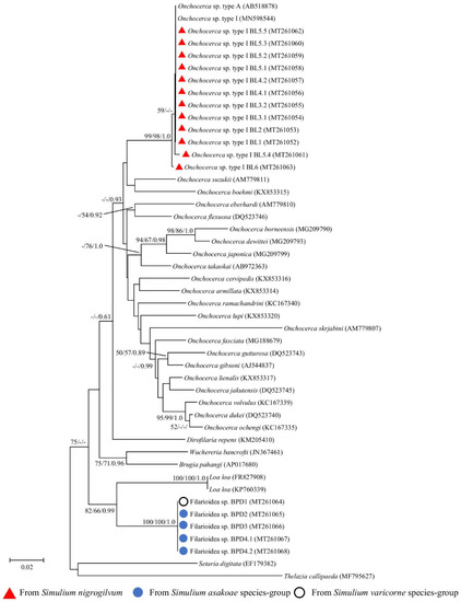 Neighbor-joining tree of Onchocerca spp. and unknown filarial larvae based on the cox1 gene sequences. Bootstrap values and posterior probabilities (neighbor-joining (NJ)/maximum-likelihood (ML)/Bayesian inference (BI)) are shown above or near the branches. A dash indicates that support values are less than 50% (for NJ and ML) or 0.50 (for BI). The scale bar represents 0.02 substitutions per nucleotide position. Red triangles, blue circles, and white circle with a black border before each specimen designate the specimens obtained from this study and also indicate the vector blackfly species.