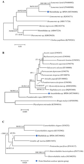 Neighbor-joining trees of non-filarial nematodes. Bootstrap values and posterior probabilities (NJ/ML/BI) are shown above or near the branches. A dash indicates that support values are less than 50% (for NJ and ML) or 0.50 (for BI). Blue circles before each specimen designate the specimens obtained from this study and also indicate the vector blackfly species. (A) An 18S rRNA tree of mermithid nematodes. (B) An 18S rRNA tree of ascaridoid nematodes. (C) An 12S rRNA tree of rhabditida nematodes.