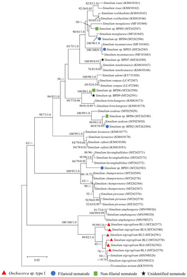 Neighbor-joining tree of infected black flies based on cox1 gene sequences. Bootstrap values and posterior probabilities (NJ/ML/BI) are shown above or near the branches. A dash indicates that support values are less than 50% (for NJ and ML) or 0.50 (for BI). The scale bar represents 0.02 substitutions per nucleotide position. Red triangles, blue circles, green squares, and black stars before each specimen designate the specimens obtained from this study and also indicate the species/group of nematode larvae recovered.