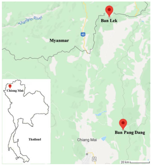 Adult black fly collections were carried out at two selected sites in Chiang Mai province, northern Thailand (Figure 6). The first selected site was an open grassland located in Ban Lek village (20° 04′36.3′′ N 99°10′53.0′′ E, 1571 m in elevation), Fang district. The second selected site was in a pig farming area situated in Ban Pang Dang, Doi Saket district (19°01′30.9′′ N 99°19′02.7′′ E, 673 m in elevation).