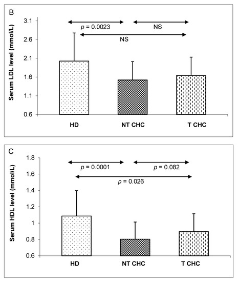 A comparison of serum total cholesterol (A), low-density lipoprotein (LDL) (B) and high-density lipoprotein (HDL) (C) levels between three independent groups: healthy donors (HD), untreated CHC patients (NT CHC), and CHC patients six months after pegIFN-α/ribavirin treatments (T CHC) (via the Kruskal–Wallis test). NS = non-significant.