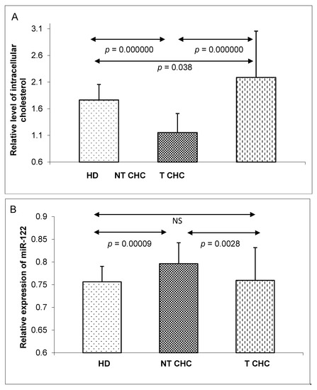 A comparison of intracellular cholesterol levels (A) and miR-122 expressions in PBMCs (B) between three groups: healthy donors (HD), untreated CHC patients (NT CHC), and CHC patients six months after pegIFN-α/ribavirin treatments (T CHC) (via the Kruskal–Wallis test). NS = non-significant.