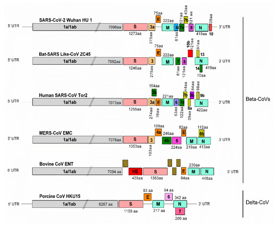 Genome organization of SARS-CoV-2 and its comparison with other coronaviruses. The coding regions of beta-CoVs, SARS-CoV-2 Wuhan-HU-1 (NC_045512.2; 29,903 bps), bat SARS-like-CoVZC45 (MG772933.1; 29,802 bps), human SARS-CoV Tor2 (AY274119.3; 29,751 bps), MERS-CoV EMC (NC_019843.3; 30,119 bps), bovine CoV ENT (NC_003045.1; 31,028 bps), and a delta-CoV, the porcine CoV HKU15 (NC_039208.1; 25425 bps) are presented. The genomes consist of a 5′ untranslated region (5′ UTR), an open reading frame (ORF 1a/ab) encoding non-structural proteins (nsps), structural proteins, hemagglutinin–esterase, spike (S), membrane (M), envelope (E), and nucleocapsid (N) proteins, several accessory proteins, and a 3′ untranslated region (3′ UTR). The lengths of the ORFs, nsps, and accessory proteins are not drawn to scale.