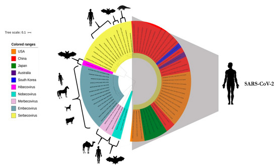Maximum likelihood tree of Betacoronaviruses, including SARS-CoV-2. The phyloanalysis included SARS-CoV-2 originating from China, the USA, Australia, Japan, and South Korea. Different subgenera of Betacoronaviruses have been labeled with different colors according to the color legend on the left side of the tree. Major species of each subgenus have been depicted in front of each clade.