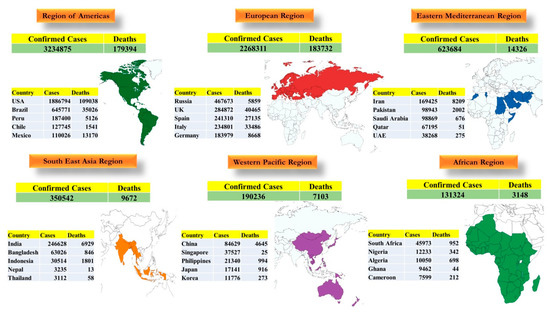 COVID-19 has affected almost every country across the globe. On 31 December 2019, an “urgent notice on the treatment of pneumonia of unknown cause” was issued to the Wuhan Municipal Health Center. The market premises were disinfected, and the stallholders were instructed to wear masks. Till 3 January 2020, 44 case-patients with pneumonia of unknown etiology were reported to the WHO from China, although the cause was not identified. On 7 January 2020, the Chinese authorities identified a new type of CoV and shared its genetic sequence on 12 January 2020. On 9 January, the death of a 61-year-old man was the first reported case of death from COVID-19. The WHO published interim laboratory guidelines for the detection of SARS-CoV-2 [65]. As of 7 June, 2020, COVID-19 distribution was seen globally with large number of confirmed cases and deaths. The WHO defined six regions to distribute the COVID-19 disease (Figure 5).