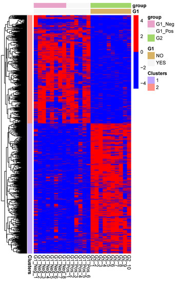 Figure 2 shows the expression profiles of the significantly up and downregulated genes from the MLN of FIP cats (G2) as compared to the non-FIP cats (G1). Two well-defined gene clusters are visible, representing transcriptional signatures for FIP and the non-FIP groups.