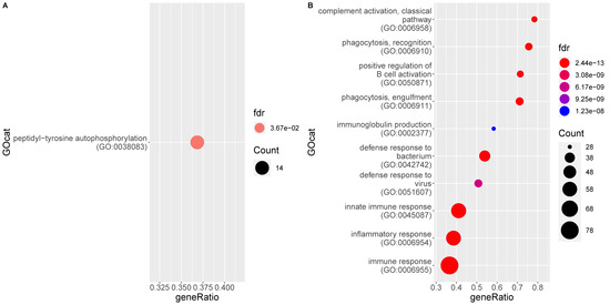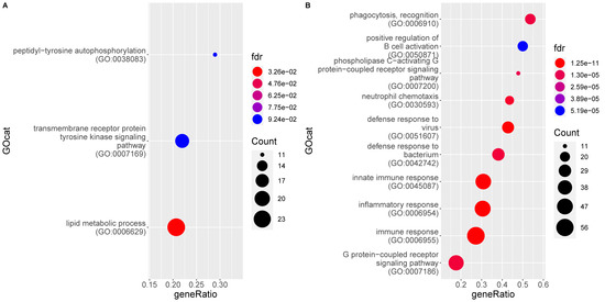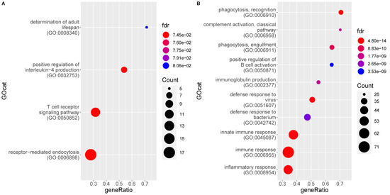 Enrichment of gene ontology (GO) categories based on genes differentially regulated in mesenteric lymph nodes of FIP cats (G2) as compared to the non-FIP cats (G1). The hypergeometric test without replacement is used. “Count” is the number of genes belonging to the category and also differentially expressed in the comparison while the x-axis is the ratio between “Count” and the total number of genes in the category. “Fdr” is the Benjamini-Hochberg-adjusted p-value derived from the hypergeometric test. (A) Downregulation driven enrichment in FIP; (B) upregulation driven enrichment in FIP.