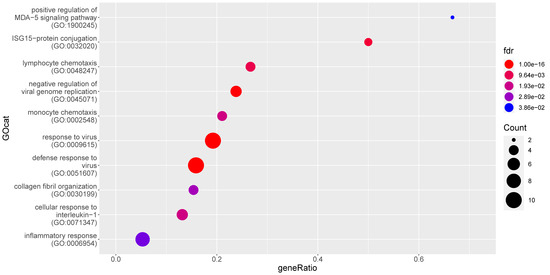 Functional analysis of the genes significantly upregulated in FIP reveals 83 enriched gene ontology (GO) terms associated to a biological process (BP) (Supplementary Table S2). They all refer either directly to the immune system or to a related process (e.g., signaling pathways). The significant processes represent responses to both viral (e.g., defense response to virus) and bacterial (e.g., defense response to bacterium) infection as well as phagocytosis, apoptosis, and pro-inflammatory processes such as IL-6 production, chemotaxis, and complement activation. Both innate and adaptive immune processes are enriched, with multiple terms referring to B cell signaling, activation, and antibody production. Figure 3 shows the ten most enriched GO BP terms of this analysis. Molecular function (MF) terms are similar to BP terms, whilst cellular component (CC) categories mainly relate to the endoplasmic reticulum and Golgi apparatus, presumed secondary to viral packaging [49].