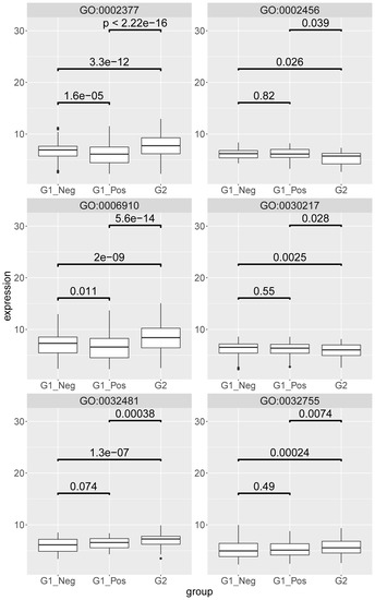 Boxplot of the mesenteric lymph node expression levels of the genes identified beyond background noise and annotated to the following gene ontology (GO) terms: GO:006910-phagocytosis recognition; GO:032481-positive regulation of type I interferon production; GO:030217-T cell differentiation; GO:002456-T cell mediated immunity; GO:032755-positive regulation of interleukin-6 production; GO:002377-Immunoglobulin production. G1_neg–non-FIP FCoV negative; G2-FIP; G1_pos–non-FIP FCoV positive. The value is the log-scaled expression from the individual genes. p-values are calculated with a Wilcoxon signed rank test.