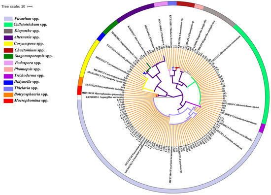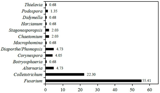 To uncover the seedborne fungal population associated with intercropped soybean, 148 isolates were recovered from the surface-sterilized seeds of 12 soybean cultivars. The partial sequences of ribosomal DNA internal transcribed spacer (rDNA ITS) of these isolates were amplified and analyzed using BLAST in NCBI database, and the results show that they had 99–100% identities with Fusarium spp., Colletotrichum spp., Alternaria spp., Corynespora spp., Diaporthe/Phomopsis spp., Stagonosporopsis spp., Chaetomium spp., Podospora spp., Botryosphaeria spp., Thielavia spp., Macrophomina spp., Harzianum spp. and Didymella spp. (Table S1). Phylogenetic analysis showed these isolates were clearly classified into different clades in the maximum-parsimony tree (Figure 1). Among them, isolates of Fusarium genus accounted for 55.00% (82/148) of all fungal isolates, followed by Colletotrichum for 22.30% (33/148), while Alternaria and Diaporthe/Phomopsis displayed the same isolation percentage (4.73%, 7/148) (Figure 2). In addition, the isolation frequency of other genera was less than 4.05%. Hence, Fusarium was the biggest seedborne fungal genus associated with intercropped soybean, and Colletotrichum was the second one.