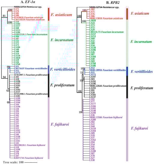 Phylogenetic trees constructed based on EF-1α and RPB2 genes. In total, 73 representative Fusarium isolates, including 27 isolates of F. fujikuroi, 20 of F. incarnatum, 9 of F. proliferatum, 4 of F. asiaticum and 3 F. verticillioides, were used for both phylogenetic trees, while Nectriaceae sp. (NRRL52754) was used as the outgroup. those referred sequences and were obtained from Fusarium MLST and Fusarium ID databases. (A) The maximum-parsimony tree of EF-1α gene was constructed by MEGA 7.0.26, and the tree parameters were 138 steps for TL, 0.934 for CI, 0.996 for RI and 0.960 for RCI. (B) The maximum-parsimony tree of RPB2 gene, and the tree parameters were 568 steps for TL, 0.897 for CI, 0.992 for RI and 0.943 for RCI. Bootstrap support values were obtained from 1000 replications. The bootstrap values >60 are shown in the trees. The tree scale was 100. Different colors indicate different Fusarium species.