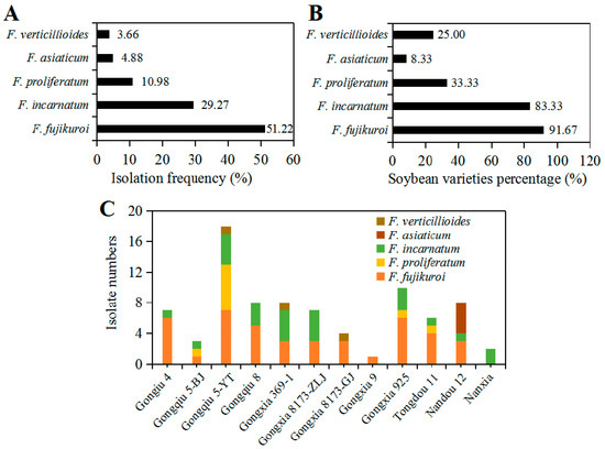 Isolation frequency and variety-specificity of Fusarium species associated with soybean seeds: (A) Tsolation percentage of each Fusarium species in total Fusarium isolates; (B) the percentage of soybean varieties colonized by Fusarium species; and (C) isolate numbers of Fusarium species recovered from different soybean varieties. The difference of isolation percentage and soybean varieties percentage was analyzed by Fisher’s exact test.