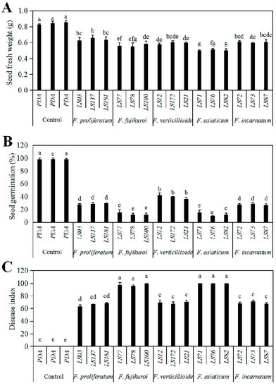 Growth and disease parameters of soybean cultivar Nandou12 after inoculated with the representative isolates of Fusarium species. The representative isolates include F. proliferatum LS03, LS137 and LS181; F. fujikuroi LS77, LS78 and LS100; F. verticillioides LS12, LS172 and LS21; F. asiaticum LS71, LS76 and LS82; and F. incarnatum LS72, LS73 and LS87. PDA was the control, meaning the seeds inoculated with PDA plugs instead of Fusarium isolates. Means of germination percentage (A) and fresh weight (B) of soybean seeds were tested after seven-day inoculation, and disease indices (C) were calculated according to disease grade by the statistical analysis using SPSS ANOVA. The data correlation was conducted by generalized linear model (GLM) with quasipoisson distribution for residuals, and statistical analysis was performed by Duncan’s test using SPSS Statistics 21. Different lowercase letters indicate the significant difference at the level of 0.01.