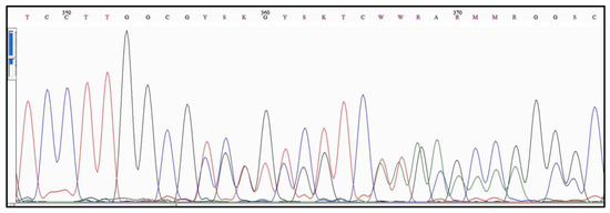 Example of a polymorphic sample from a portion of the allele region of a T4 isolate. The overall sequence represents two alleles within a single isolate of Acanthamoeba. The electropherogram shows multiple peaks at numerous sites within the sequence. Knowledge of potential allele sequences from Acanthamoeba allows the identification of both alleles present in the isolate.