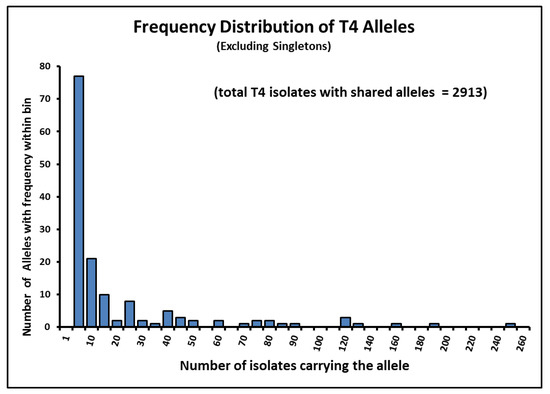 We have opted to retain in our expanded list any allele designation that was identified prior to 2015, regardless of whether the allele sequence occurred in multiple isolates. Allele numbering ambiguities were dealt with as follows: (1) the first 21 alleles would retain their identifiers (T4/01 to T4/21) [72,75]; (2) alleles identified in 2010 or 2013 would be labeled as defined in the original papers, but with a prefix identifying the author source of the label. Thus, alleles from Japan [76] would be labeled AKT4/22 and AKT4/23, alleles from China [77] would be labeled ZT4/22 to ZT4/28, the allele from Brazil [78] is labeled DT4/29, and the alleles from Spain [79] are labeled MT4/22 to MT4/25. Finally, the new alleles observed in the study from France [80] are labeled RT4/31 to RT4/34. Note that RT4/34 and MT4/24 are identical in sequence; since both papers were submitted on the identical date, but, since the French paper was accepted earlier, we assign any isolates with this sequence to allele RT4/34.