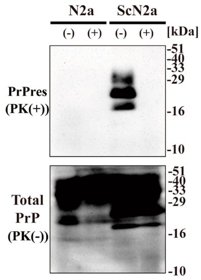 The protein concentration of samples was measured by using a Bio-Rad DC protein assay kit (Bio-Rad, Hercules, CA, USA). The sample (200 µg of protein per 100 µL) was incubated with or without PK at 20 µg/mL for 1 h at 37 °C to discriminate PrPres from PrPC (only PrPres is detected after PK treatment, whereas total PrP are detected in the absence of PK treatment). An equal volume of 2× SDS gel-loading buffer (90 mM Tris/HCl (pH 6.8), 10% (v/v) 2-mercaptoethanol, 2% (w/v) SDS, 0.02% bromophenol blue, and 20% (v/v) glycerol) was added and the samples were heated at 100 °C for 10 min to terminate the reaction prior to Western blotting.