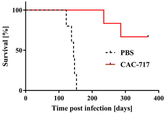 Mice injected with scrapie prions that had been pre-treated with CAC-717 survive longer than those injected with PBS-treated scrapie prions. Shown are the survival curves of Tga20 mice injected intracerebrally with CAC-717-treated Chandler prion-infected ScN2a cell lysate (red line) or the corresponding PBS-treated counterpart (dotted black line). Mice injected with CAC-717-treated prions survived significantly longer as compared with mice injected with PBS-treated prions (log-rank test, p < 0.01).