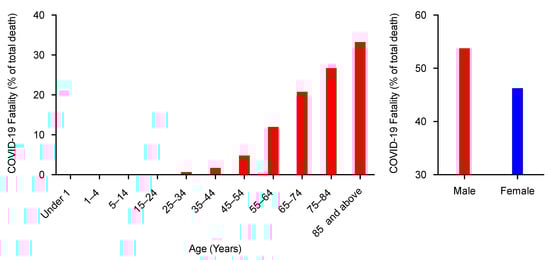 ACE2 receptor is coexpressed with TMPRSS2, a cellular transmembrane protease that cleaves the S protein of SARS-CoV-1 and SARS-CoV-2 into two fragments: S1, which is essential for virus attachment, and S2, for virus fusion into the target cells [47,54,55,56]. TMPRSS2 protein is expressed in many tissues, including the lungs, primarily in the epithelial cells [57,58]. The expression levels of TMPRSS2 protein are regulated by levels of androgen and androgen receptors [58,59,60,61], suggesting sex-related expression levels of TMPRSS2 protein. Both women and children have a lower level of androgen and androgen receptors than men, and therefore, TMPRSS2 could play a potential role in the severity of COVID-19 pathogenesis in men. This pattern is supported when we take the total deaths in the United States due to COVID-19 and consider the breakdown of age percentages and sex distribution (Figure 1) [62]. The percentage of deaths in male patients is higher compared to female COVID-19 patients. Thus, it could be possible that the expression levels of ACE2 and TMPRSS2 impact virus infectivity and pathogenesis among different groups of individuals, considering the variation in the expression levels in older men compared to the women and children.