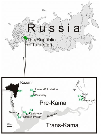 - Stupishyn, A.V.; Babanov, Y.V.; Guseva, A.A. Physico-geographical zoning of the Middle Volga. Kazan; Kazan University Publishing: Kazan, Russia, 1964; p. 197. (In Russian) [Google Scholar]