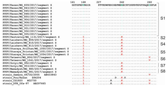 Analysis of the amino acid (aa) sequences of amplified S segment fragments revealed that they were 100% identical within strains from each trapping site. When comparing “RT-2017” aa sequences and previous PUUV isolates, three aa substitutions were identified: Ile168Val, Arg242Lys, and Ile260Val (Figure 2). Ile168 was detected only in strains of the S1 site; Arg242 was found in isolates from S1, S6 sites and in Samara_49/CG/2005 strain, while other RUS lineage strains have Lys242; Val260 was found only in strains from S6 site and in Samara_49/CG/2005, CG1820 and DTK/Ufa-97 strains (Figure 2).