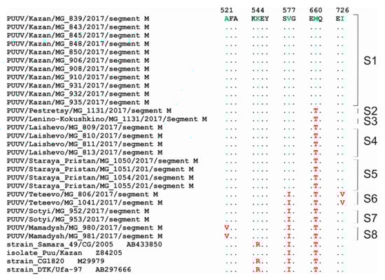 Differences in the aa sequences of the M segment within the clusters were 0.0–0.3% while it was higher, 0.3–1.2%, between sequences from different clusters (Table 4). When “RT-2017” aa sequences were compared to Samara_49/CG/2005 and Puu/Kazan strains, divergence was 0.3–1.2%; however, differences were more pronounced when compared to CG1820 and DTK/Ufa-97 strains, 3.0–3.6%, and 1.5–2.1%, respectively (Table 5). The number of aa substitutions specific for “RT-2017” obtained from the individual sites was identified. For example, the Ala521Val mutation was found in strains from the S8 site, while Ile726Val substitution was characteristic from the S6 site. Also, the Thr660Met mutation was detected in the strains from the S1 site. It should be noted that Ile577Val mutation was found in all strains from cluster A; however, all “RT-2017” contained Lys at aa 544 positions, similar to that in Puu/Kazan strain, not Arg, which is present in Samara_49/CG/2005 strain (Figure 3).