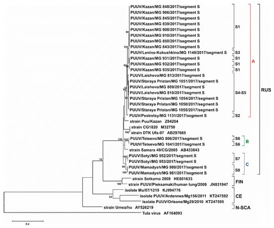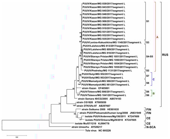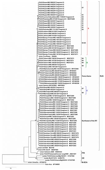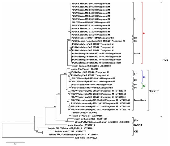 In the previous investigations, we have performed a comparative analysis of partial S and M segment sequences of the PUUV strains circulating in the Pre-Kama and Trans-Kama area and have demonstrated a significant variation of PUUV strains’ genome in the RT [,]. It has been shown that the PUUV strains in the bank voles from Zelenodolsky and Vysokogorsky districts diverged significantly from the virus strains found in Laishevsky and Pestrechinsky districts []. The current study aims to analyze the genetic variability of PUUV in the Pre-Kama region. Also, we sought to identify PUUV strains, which could be the product of recombination and reassortment. These results could be used to map PUUV strains circulating in RT and investigate the mechanisms leading to the emergence of the new PUUV strains in RT.