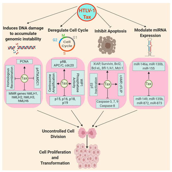 Tax induction of DNA damage, deregulation of the cell cycle, inhibition of apoptosis, and modulation of miRNA expression. Upon DNA damage, Tax suppresses ataxia-telangiectasia mutated (ATM) kinase activation and mediator of DNA damage checkpoint 1 (MDC1) to increase genomic instability with subsequent impairment of homologous recombination, and inhibits mismatch repair (MMR) regulatory genes to block mismatch repair to induce DNA damage. Additionally, Tax increases proliferating cell nuclear antigen (PCNA) expression to overcome the p21waf1/cip1-mediated replication block to sustain DNA replication with increased mutation frequency for the accumulation of genomic instability. Tax deregulates the cell cycle and transcribes S phase genes through the hyperphosphorylation of Rb and enhances WIP1 phosphatase activity with concomitant inhibition of CDK4 inhibitors such as p15, p16, p18 and p19, and tumor suppressor p53. Tax also facilitates M phase transition by the activation of anaphase-promoting complex (APC) and its binding partner cdc20 and induces centrosome amplification to trigger aneuploidy. Tax inhibits apoptosis by enhancing the expression of anti-apoptotic proteins such as X-linked inhibitor of apoptosis (XIAP), survivin, BCL-2, Bcl-xL, Bfl-1/A1 and cFLIP and impairs caspase signaling by inactivation of caspase-3, -7, -8 and -9. Tax also stabilizes anti-apoptotic MCL-1 through K63-linked polyubiquitination. Tax promotes functional inactivation of p53 through its phosphorylation and induces expression of Ras proteins and cyclic AMP (cAMP) to augment cell proliferation with increased metabolism. Tax also modulates miRNA expression to fine-tune gene expression for cellular transformation. Tax upregulates miR-146a, miR-130b and miR-155, and downregulates miR-149, miR-135b, miR-872 and miR-873 to promote the proliferation of infected T cells.