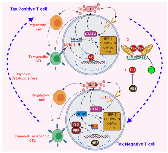 Anti-sense RNAs containing the HTLV-1 LTR region, and RNA from the Rex-responsive element in the LTR have been proposed to regulate NF-κB activation by stimulating pattern recognition receptors (PRRs) such as RNA-dependent protein kinase (PKR) and 2’5’-oligoadenylate synthetase, an interferon stimulated gene (ISG), in Tax-negative ATLL cells [251,252]. Interestingly, ATLL patients express high serum levels of the cytokine IL-10, likely induced by NF-κB signaling, which exhibits immunosuppressive functions partly via regulatory T cells (Tregs) in a positive feedback regulation resulting in impairment of Tax-specific CD8+ T cells [253,254,255]. The persistent levels of IL-10 are also maintained through the activation and phosphorylation of signal transducer and activator of transcription 3 (STAT3), which likely plays a role in the expression of anti-apoptotic genes for lymphoproliferation, even in the absence of Tax [256]. Tax expression is downregulated in ~60% of ATLL due to mutations, deletions or epigenetic changes [257]. Intriguingly, Tax expression in a minor fraction of ATLL leukemic cells maintains the whole population of leukemic cells, and Tax expression fluctuates between on and off states [242]. Taken together, HTLV-1 fine-tunes the expression of Tax, which is commonly downregulated in ATLL, to evade anti-viral immune responses and establish a persistent infection which could lead to leukemia/lymphoma in a subset of infected individuals (Figure 3).
