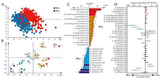 Age-dependent antibody responses to the oral bacteria test panel. Partial least square analyses with antibody responses as independent x-variables modeled against age as y were used to explore age associations with antibody profiles. (A) Partial least square (PLS) scatter plot (each symbol represents a participant) shows clustering of 30-year-olds versus 50-year-olds based on the concerted antibody profile. (B) PLS loading plot illustrating the association between each bacteria sample (colored dots, for numbers see Supplementary file Table S1) and age (open rings). Gray dots indicate non-significant x-variables. (C) Bar graph showing significant PLS correlation coefficients (CoeffCS) in the 50-year-old and 30-year-old groups. Red and dark blue colors indicate associations that are significant according to both the variable in projection score (B) and the PLS correlation coefficient (C), whereas orange and light blue colors indicate associations that are significant according to the PLS correlation coefficient only. (D) Odds ratios (ORs) with 95% confidence intervals (CIs) in the 50-year-old or 30-year-old age groups based on binary logistic regression with an antibody response to each of the 34 bacterial samples, including sex, smoking, and storage time as covariates. The red color indicates antibody responses that were significantly increased among the 50-year-olds and the blue color those that were increased among the 30-year-olds. Significance was considered for p-values < 0.05 with false discovery rate (FDR) after adjusting for multi-comparison using the Benjamini Hochberg correction.