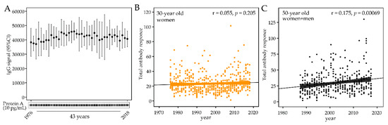 After storage stability was confirmed, the temporal trend of the total antibody response to the bacteria panel was evaluated. No trend was found among the 30-year-old women (1976 to 2018, p = 0.159, Figure 3B), but the total titer increased over time in the 50-year-old participants (1987 to 2017 pall = 0.0003, Figure 3C). The increasing trend was consistent among 50-year old men and women (pmen = 0.0008 and pwomen = 0.005).