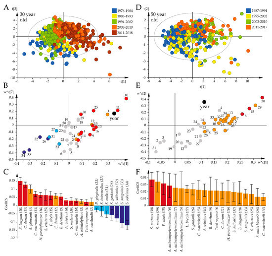 Temporal trends in the global bacterial antibody response profiles for the 30-year-old and 50-year-old participants. Results from PLS modeling with antibody responses as independent x-variables and time periods as dependent variables are illustrated in a loading scatter plot (indicating subject distribution), loading plot (indicating sample distribution), and PLS correlation coefficient plot (indicating mean correlations with 95% CI). (A–C) The 30-year-olds. (D–F) The 50-year-olds. Red/orange bars indicate significantly increased and blue/light blue significantly decreased responses over time. Red and dark blue coloring indicate significant associations according to both the variable projection scores and the PLS correlation coefficients, whereas orange and light blue coloring indicate significance according to the PLS correlation coefficient only. Gray dots in (B) and (E) indicate non-significant x-variables.