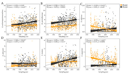 Temporal trends in antibody responses to select bacterial species. Scatter plots of the antibody responses over time for the 30-year-old and 50-year-old groups for (A) Aggregatibacter actinomycetemcomitans, (B) Haemophilus parainfluenzae, (C) Streptococcus sobrinus, (D) Actinomyces johnsonii, (E) Streptococcus mutans, and (F) Streptococcus sanguinis. The dots represent individual subjects and the lines trends with 95% CI.