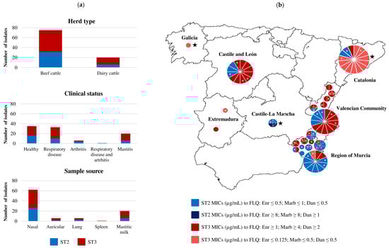 Epidemiological background of the 95 Mycoplasma bovis isolates included in this study: (a) Number of isolates of each subtype (ST) depending on the herd type, clinical status, and sample source; (b) Geographical origin of each isolate. Each circle represents a farm except in Catalonia, where a milk analysis laboratory provided samples. The radius of each circle is proportional to the number of isolates collected from the farm. Isolates collected from mastitic milk are indicated with a black star. Isolates linked with a grey line were obtained from the same animal. Isolates selected for whole-genome sequencing are indicated with a white asterisk. Enr = Enrofloxacin; Marb = Marbofloxacin; Dan = Danofloxacin.