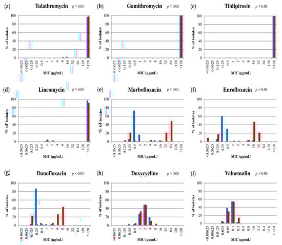 Antimicrobials used for MIC assays included (i) the macrolides, tulathromycin (Carbosiynth, Compton, UK), gamithromycin (Sigma-Aldrich, St. Louis, MO, USA) and tildipirosin (Carbosiynth, Compton, UK), (ii) the lincosamide, lincomycin (Sigma-Aldrich, St. Louis, MO, USA), (iii) the FLQ, enrofloxacin (Fluka, Bio-Chemika, St. Louis, MO, USA), marbofloxacin (Tokio Chemical Industry, Chuo City, Japan) and danofloxacin (Fluka, Bio-Chemika, St. Louis, MO, USA), (iv) the tetracycline, doxycycline (Sigma-Aldrich, St. Louis, MO, USA), and (v) the pleuromutilin, valnemulin hydrochloride (Sigma-Aldrich, St. Louis, MO, USA). Stock solutions (1 mg/mL; 0.1 mg/mL for valnemulin hydrochloride) and two-fold dilutions were prepared in sterile distilled water. For preparing enrofloxacin, marbofloxacin, and danofloxacin, 0.1 M HCl was added dropwise until dissolution occurred and the volume was adjusted with sterile distilled water. A final range from 128 µg/mL to 0.0625 µg/mL was tested except for valnemulin, for which a final range from 12.8 µg/mL to 0.00625 µg/mL was studied.