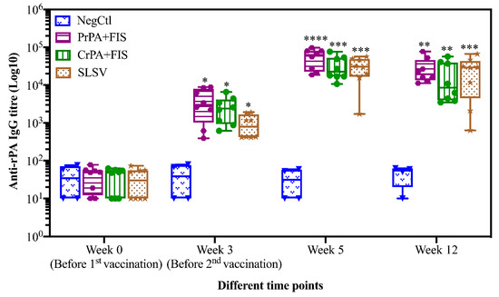 Anti-recombinant protective antigen (rPA) IgG-titres in vaccinated cattle presented as box and whisker plots. The cattle were vaccinated twice at week 0 and 3 with PrPA+FIS+Emulsigen-D®/Alhydrogel® adjuvants (n = 8), CrPA+FIS+Emulsigen-D®/Alhydrogel® adjuvants (n = 8), Sterne live spore vaccine (SLSV) (n = 8) and NegCtl (Emulsigen-D®/Alhydrogel® adjuvants) (n = 4) with sera collected before the vaccinations at week 0 and 3 as well as samples collected at week 5 and 12. Sera dilution started at a concentration of 1:100 and values <50 were given an arbitrary value of 10. IgG titres in each vaccinated group were compared to the respective pre-immune titres. The significant values between groups are presented as **** p < 0.0001, *** p < 0.001, ** p < 0.01 and * p ≤ 0.05. PrPA: Purified recombinant protective antigen, CrPA: Crude recombinant protective antigen FIS: Formalin inactivated spores, SLSV: Sterne live spore vaccine, NegCtl: Negative control vaccinated with Emulsigen-D®/Alhydrogel® adjuvants.