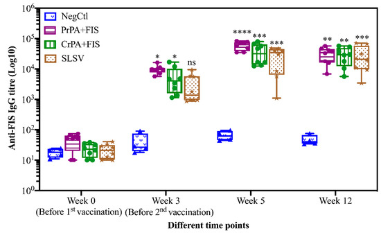 Anti-FIS IgG-titres in vaccinated cattle presented as box and whisker plots. The cattle were vaccinated twice at week 0 and 3 with PrPA+FIS+Emulsigen-D®/Alhydrogel® adjuvants (n = 8), CrPA+FIS+Emulsigen-D®/Alhydrogel® adjuvants (n = 8), SLSV (n = 8) and NegCtl (Emulsigen-D®/Alhydrogel® adjuvants) (n = 4) with sera collected before the vaccinations at week 0 and 3 as well as samples collected at week 5 and 12. Sera dilution started at a concentration of 1:100 and values <50 were given an arbitrary value of 10. IgG titres in each vaccinated group were compared to the pre-immune titres. The significant values between groups are presented as **** p < 0.0001, *** p < 0.001, ** p < 0.01, * p ≤ 0.05. PrPA: Purified recombinant protective antigen, CrPA: Crude recombinant protective antigen FIS: Formalin inactivated spores, SLSV: Sterne live spore vaccine, NegCtl: Negative control vaccinated with Emulsigen-D®/Alhydrogel® adjuvants.