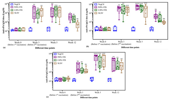The immunoglobulin subclasses titres exhibited a balance between TH1 and TH2-type responses. Even though the TH2-type immune response dominates the response at week 5, as seen with IgG2 in both NLAV and SLSV against FIS, a similar trend is also seen with IgG1 and IgG2 response against rPA at the same timepoint, which signifies the stimulation of TH1-type response as well. The IgG1 titres declined, but were still significant at week 12, unlike IgG2, which maintained the trends of titres from week 5 at week 12. However, the dynamics of the immune response switch between the immunoglobulin subclasses cannot be fully elucidated, as only four timepoints only are reported in the 12 weeks of this study.