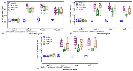 The anti-FIS IgM and IgG subclasses response in vaccinated cattle groups after the first and the second vaccination are shown in Figure 4a–c. The anti-FIS IgM titres after the first vaccination showed a significant increase for PrPA+FIS+Emulsigen-D®/Alhydrogel®, CrPA+FIS+Emulsigen-D®/Alhydrogel®, and SLSV. The increase in IgM titres at week 5 after the second vaccination for PrPA+FIS+Emulsigen-D®/Alhydrogel®, CrPA+FIS+Emulsigen-D®/Alhydrogel® and SLSV were highly significant, however these were insignificant at week 12 across all the vaccine groups when compared to week 0 (Figure 4a). The mean anti-FIS IgG1 titres also showed a significant increase for PrPA+FIS+Emulsigen-D®/Alhydrogel®, SLSV and CrPA+FIS+Emulsigen-D®/Alhydrogel® at week 3 and retained significance at week 5 across all vaccine groups. The anti-FIS IgG1 mean titres level decreased but were still significant at week 12 for SLSV and PrPA+FIS+Emulsigen-D®/Alhydrogel® but not significant for CrPA+FIS+Emulsigen-D®/Alhydrogel® (Figure 4b). The anti-FIS IgG2 mean titres’ increases were significant for PrPA+FIS+Emulsigen-D®/Alhydrogel®, CrPA+FIS+Emulsigen-D®/Alhydrogel® and SLSV at week 3, increased further at week 5 for PrPA+FIS+Emulsigen-D®/Alhydrogel® and SLSV, while declining (but still significantly higher than pre-vaccination titres) for CrPA+FIS+Emulsigen-D®/Alhydrogel®. At week 12, the anti-FIS IgG2 mean titres were significant for PrPA+FIS+Emulsigen-D®/Alhydrogel®, CrPA+FIS+Emulsigen-D®/Alhydrogel® and SLSV (Figure 4c). The immunoglobulins subclasses mean titres against rPA and FIS of NegCtl group consisting of cattle vaccinated with adjuvants did not change significantly across all the timepoints when compared to the titres at week 0.