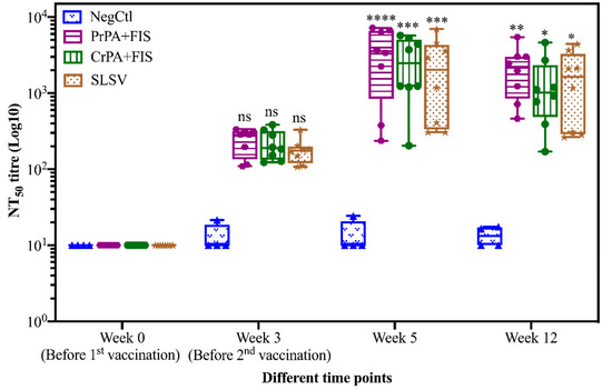Lethal toxin neutralizing titres in vaccinated cattle. The cattle were vaccinated twice at week 0 and 3 with PrPA+FIS+Emulsigen-D®/Alhydrogel® adjuvants (n = 8), CrPA+FIS+Emulsigen-D®/Alhydrogel® adjuvants (n = 8), SLSV (n = 8) and NegCtl (Emulsigen-D®/Alhydrogel® adjuvants) (n = 4) with sera collected before the vaccinations at week 0 and 3 as well as at week 5 and 12. Sera with no detectable toxin-neutralizing titres were given an arbitrary value of 10 and sera dilution started at a concentration of 1:50. Neutralizing titres in each vaccinated group were compared to the respective pre-immune titres. The significant values between groups are presented as **** p < 0.0001, *** p < 0.001, ** p < 0.01, * p ≤ 0.0.5, ns = not significant. PrPA: Purified recombinant protective antigen, CrPA: Crude recombinant protective antigen FIS: Formalin inactivated spores, SLSV: Sterne live spore vaccine, NegCtl: Negative control vaccinated with Emulsigen-D®/Alhydrogel® adjuvants.