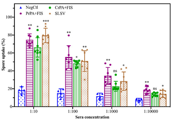 Sera collected at week 5 from cattle vaccinated with NLAV and SLSV were used to determine the potential of induced antibodies to opsonize B. anthracis spores, thereby enabling spores’ phagocytosis by RAW 264.7 macrophage (Figure 6). The macrophages showed a high level of spore uptake at 1:10 sera dilution for both SLSV and NLAV vaccine groups. The RAW 264.7 macrophages showed 80%, 75% and 66% spore uptake following treatment with immune sera from SLSV, PrPA+FIS+Emulsigen-D®/Alhydrogel® and CrPA+FIS+Emulsigen-D®/Alhydrogel® vaccine groups, respectively. The NegCtl showed the least level of macrophage spore uptake (17%) following incubation with sera (Figure 6). The spore uptake at 1:100, 1:1000 and 1:10000 dilutions of sera from the SLSV and PrPA+FIS+Emulsigen-D®/Alhydrogel® vaccine groups in the opsonophagocytosis assay remained significantly high when compared to the negative control sera (Figure 6). Sera from CrPA+FIS+Emulsigen-D®/Alhydrogel® did not show a significant macrophage spore uptake at dilutions above 1:100.