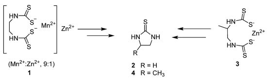 Mancozeb (1) (and Propineb, 3) metabolising to toxic thioureas 2 and 4.