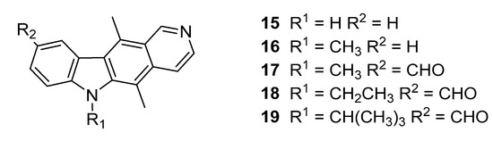 Structure of ellipticines (15,16) and ellipticine aldehydes (17–19) identified as Phytophthora infestans growth inhibitors.