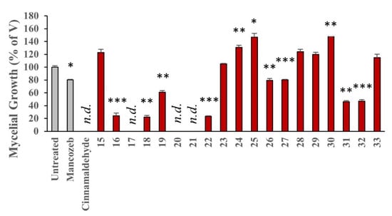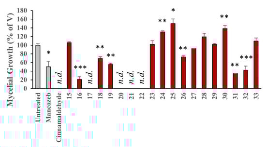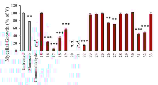 Compounds were evaluated for relative inhibitory effects on P. infestans at a concentration 25 μM for mycelium growth after five, nine and thirteen days. Of note for this assay, Mancozeb (1), the commercial pesticide, is at a test concentration of 100 μM and cinnamaldehyde (7) was also examined for comparison at a concentration of 1 mM [38].